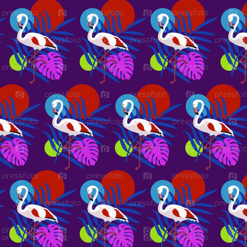 Выкройка для одежды, постельное белье с большим фламинго, голубыми пальмовыми листьями, розовыми листьями монстеры, красными, синими и светло-зелеными кругами разных размеров на фиолетово-розовом фоне