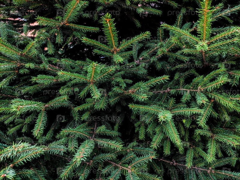 Фон с ветвями зеленых колючих елок, горизонтальная ориентация