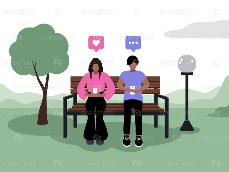 Пара с темной кожей, сидящая в телефонах в парке