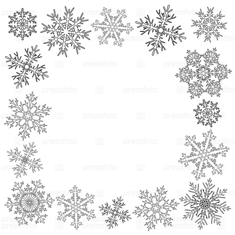 Раскраска рамки открытки с разными снежинками по краю, свободное место посередине, раскрашивание