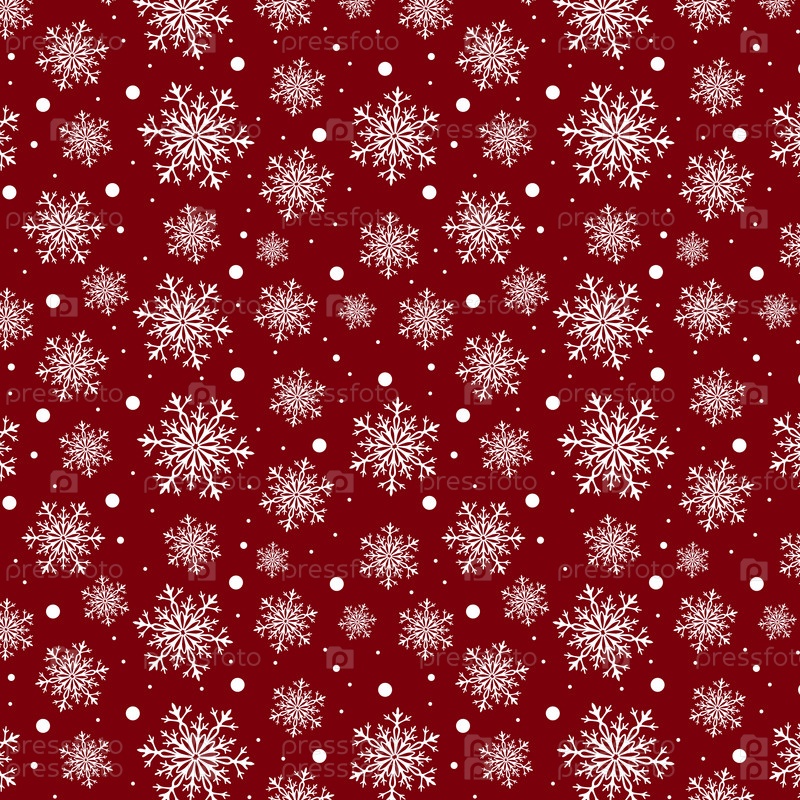 Бесшовный узор с красивыми белыми сложными снежинками и простым круглым снегом на красном фоне