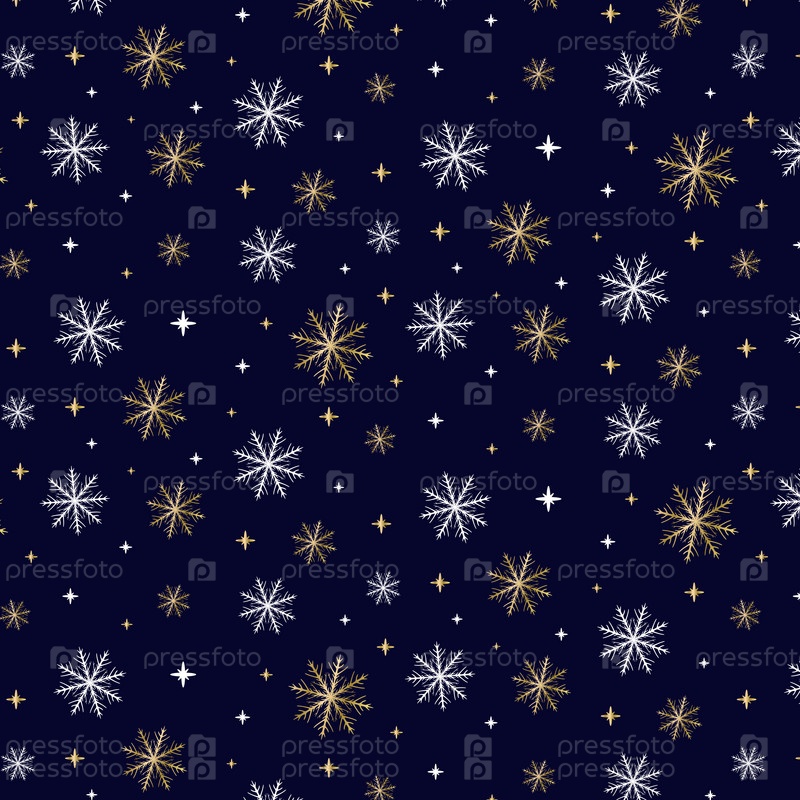 Бесшовный рождественский узор с белыми, золотыми красивыми сложными и простыми снежинками на темно-синем фоне