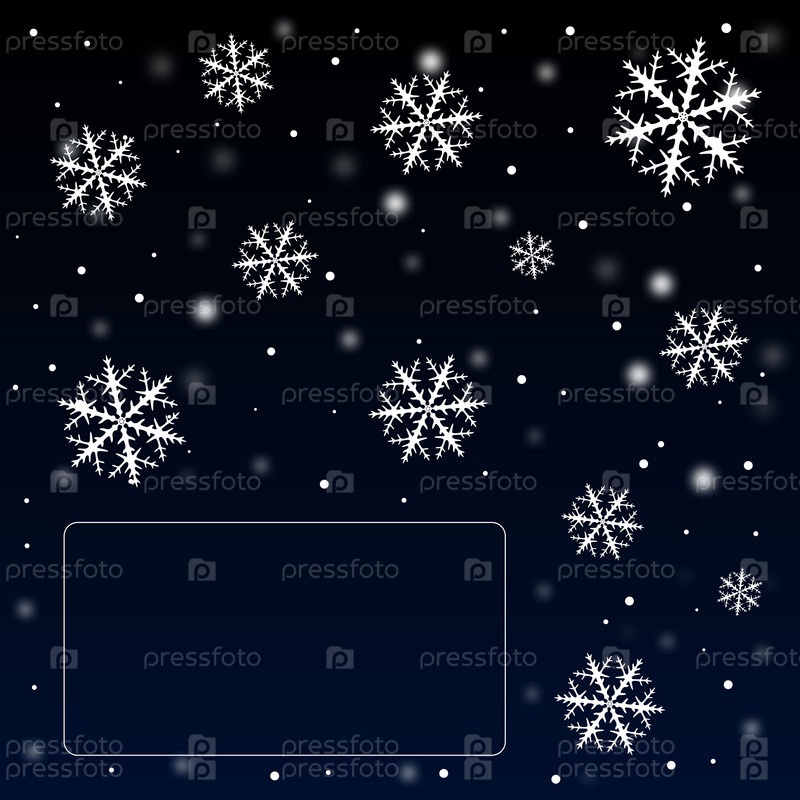Квадратная открытка с маленькой рамкой в углу для надписи, с падающим белым снегом, снежинками в небе с темно-синим переходом