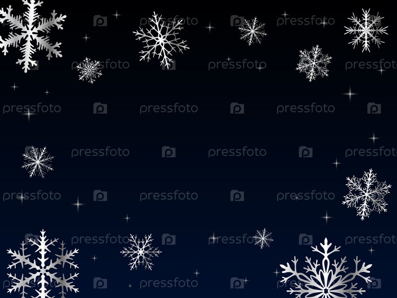 Фон прямоугольный по горизонтали с пустой серединой для текста, серебряными снежинками, звездами на темном фоне неба