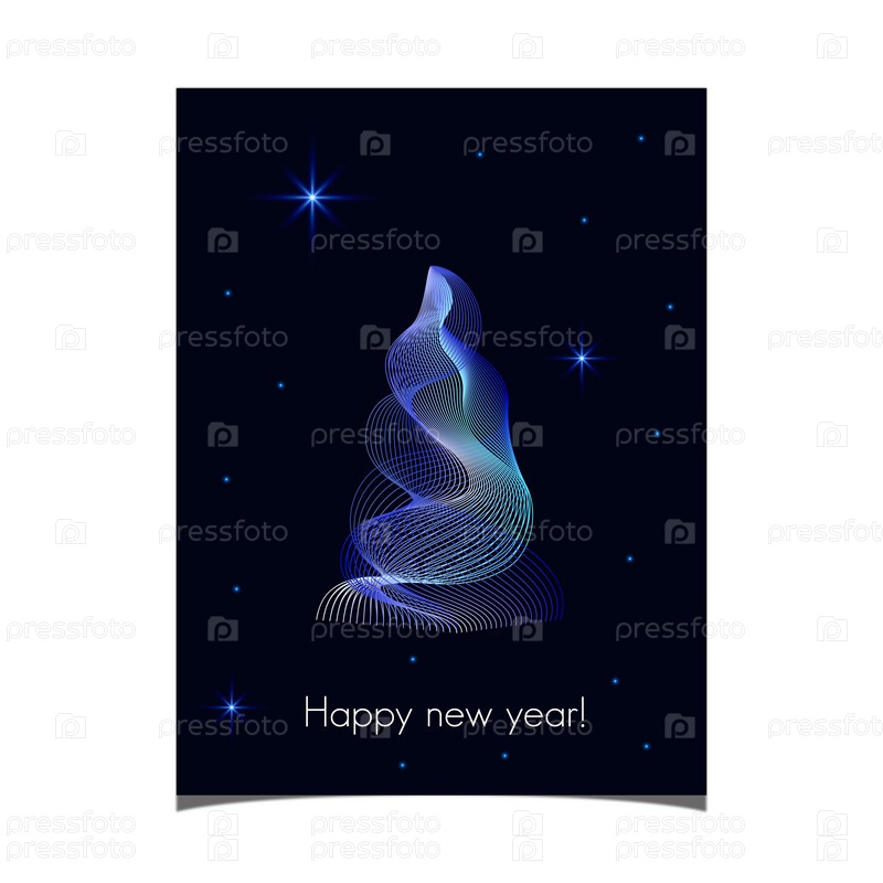 Открытка с новым годом, с современной рождественской елкой с градиентом синего света, на фоне темного неба с мерцающими голубыми звездами