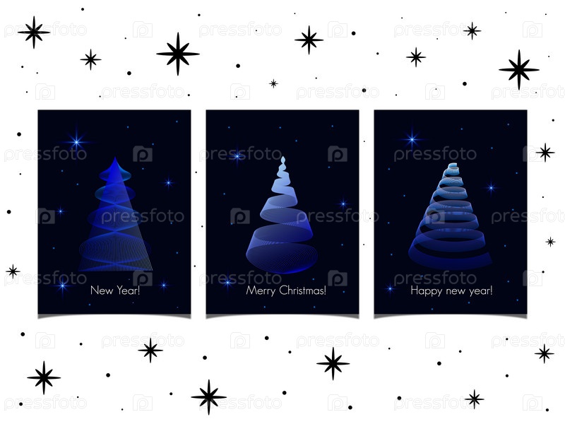 Три поздравительные открытки с современными рождественскими елками с градиентом синего света, на фоне темного неба с мерцающими голубыми звездами