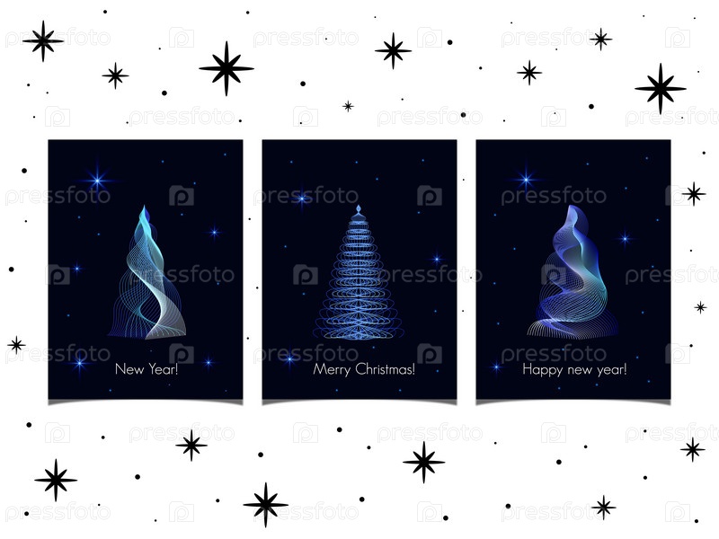 Три поздравительные открытки с современными новогодними голубыми линиями рождественских елок на фоне темного неба с мерцающими голубыми звездами
