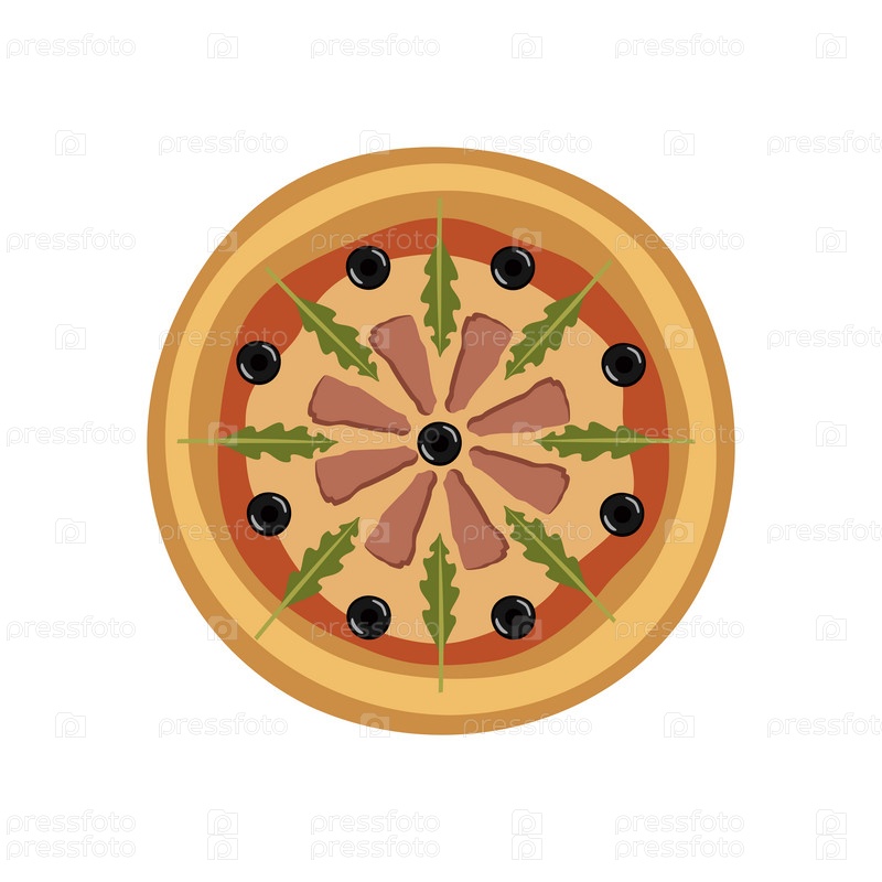 Пицца с мясом, оливками, зелеными листьями на белом фоне