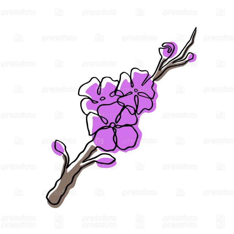 Линейная сакура с цветными пятнами коричневого, розового цвета на белом фоне