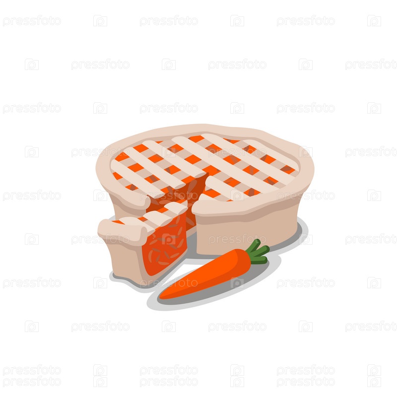 Пирог с маленьким куском рядом и морковью с тенью на белом фоне