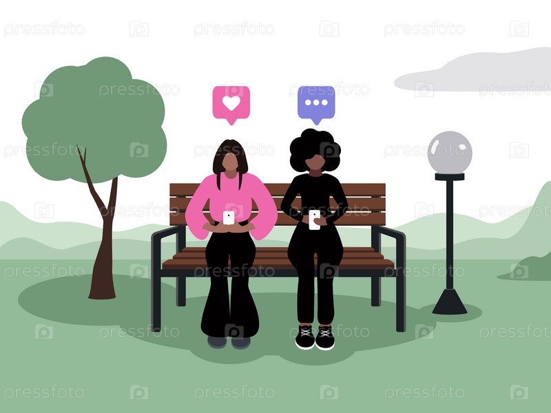 Две девушки со смуглой и темной кожей сидят в телефонах