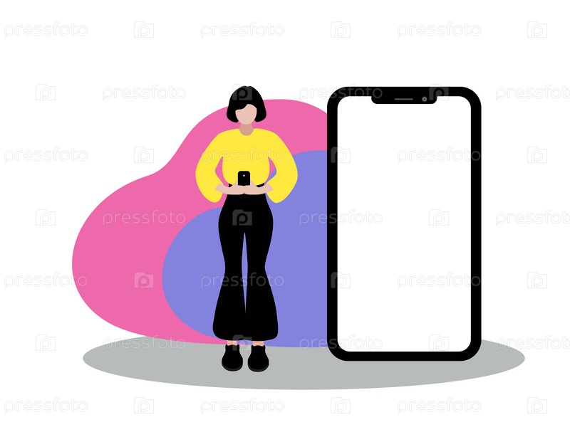 Девушка со светлой кожей, темными волосами с европейской внешностью в модной одежде печатает на телефоне, рядом большой экран телефона, смартфона на фоне абстрактных розовых и фиолетовых пятен