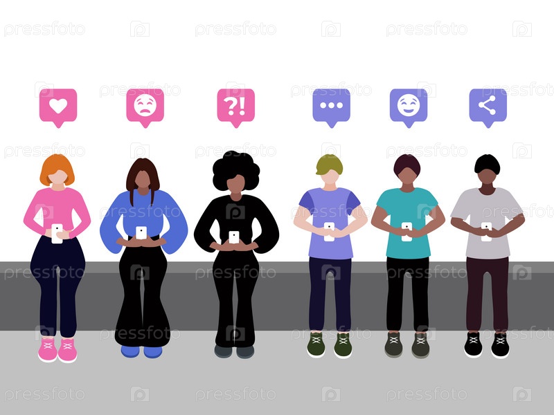Парни и девушки разных рас сидят в телефонах, социальных сетях, ставят лайки, общаются, отправляют информацию, смайлики. Над ними иконки того, что делают с телефоном