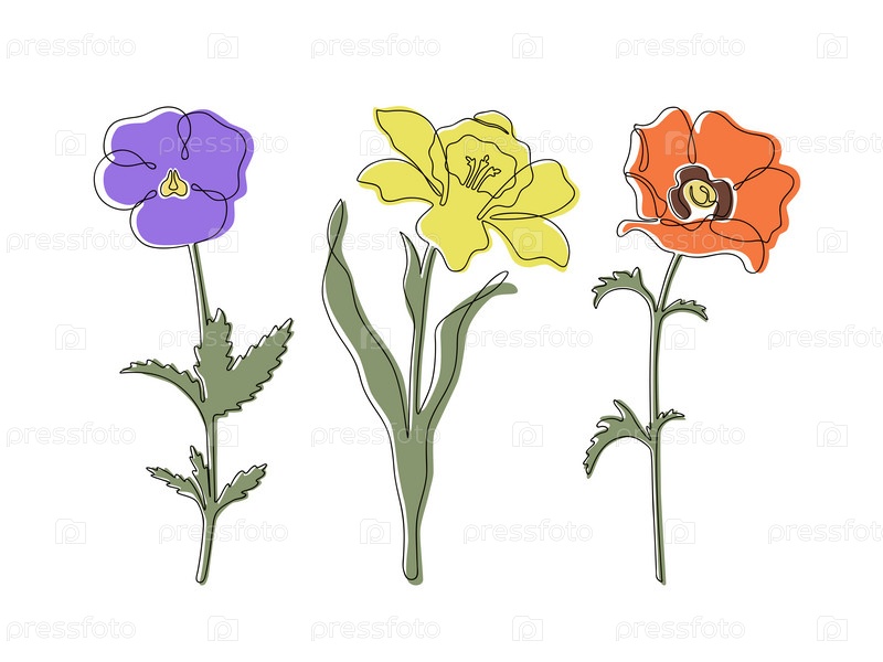 Линейные цветы фиолетовые, нарциссы, пятна мака на белом фоне