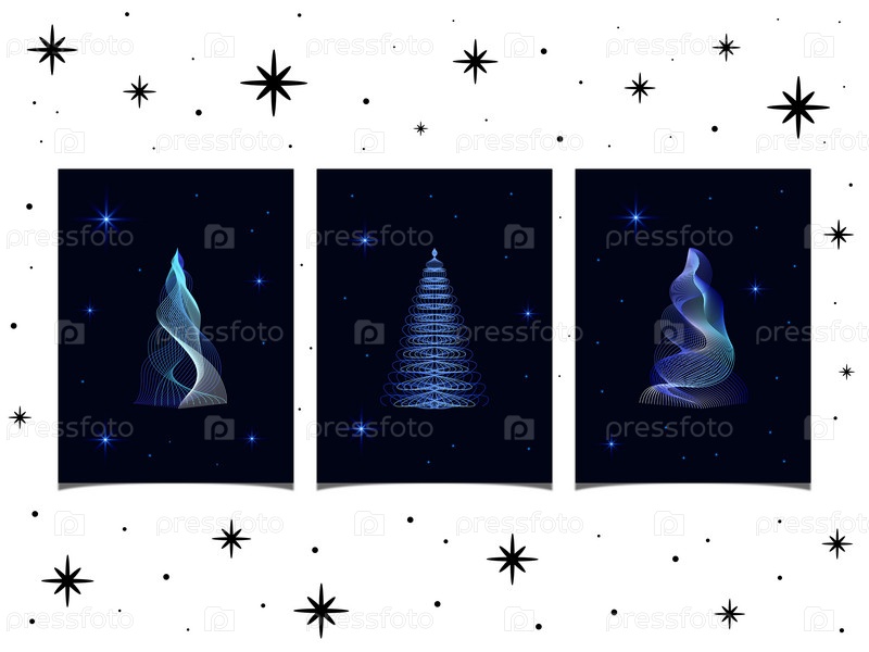 Три плаката с современными синими линиями рождественских елок на фоне темного неба с мерцающими голубыми звездами
