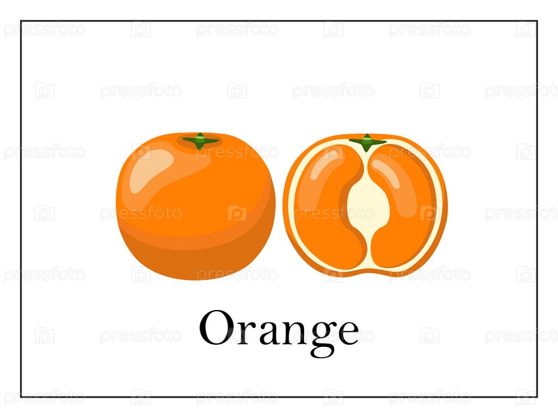 Карточка с подписанным целым апельсином и апельсином, разрезанными пополам на белом фоне в тонкой рамке