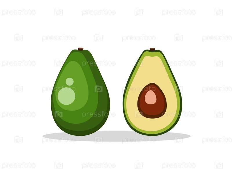 Целый и разрезанный пополам зеленый яркий красивый авокадо с тенью на белом фоне