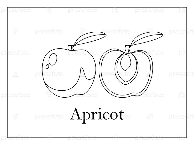 Карточка-раскраска с подписанным целым абрикосом и разрезанным пополам абрикосом на белом фоне в тонкой рамке