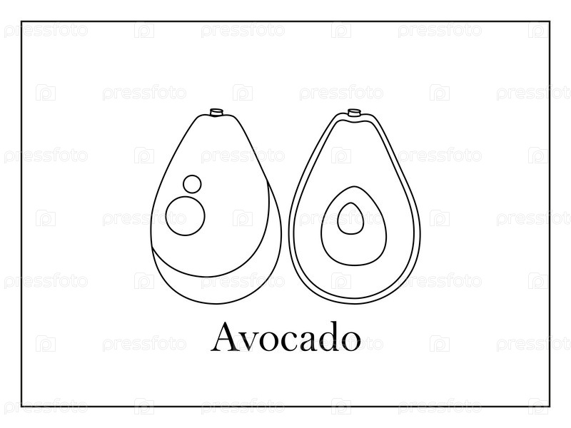 Карточка-раскраска с подписанным целым авокадо и авокадо, разрезанным пополам на белом фоне в тонкой рамке