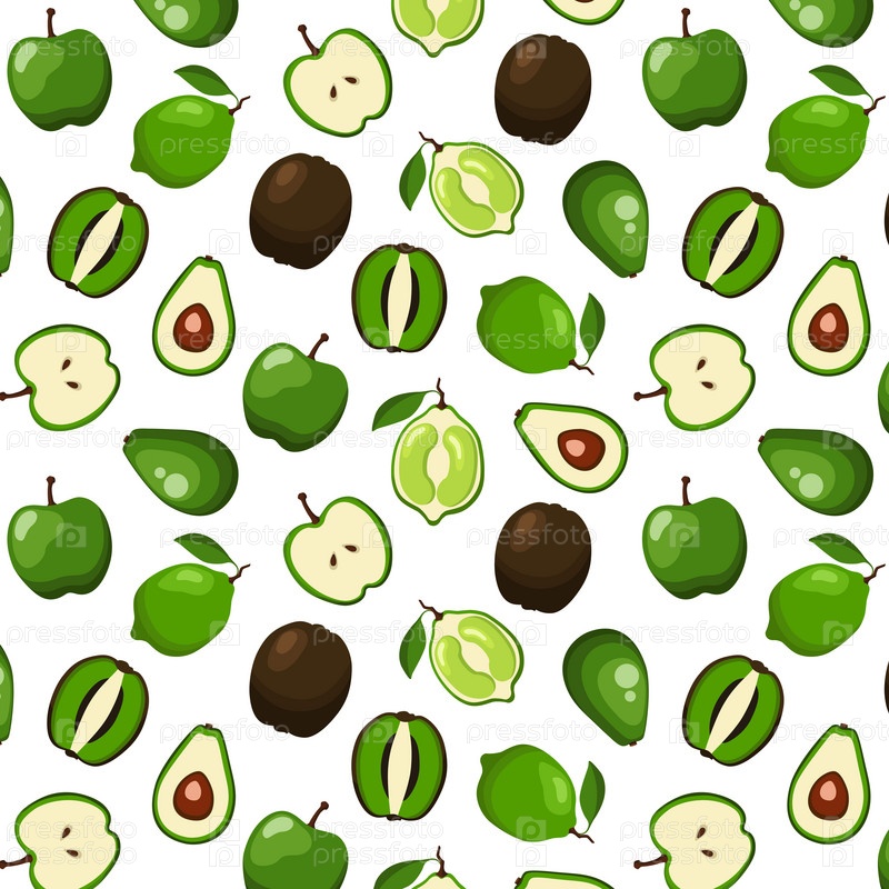 Узор бесшовный с зеленым яблоком, лаймом, киви, целым авокадо, разрезанным пополам на белом фоне
