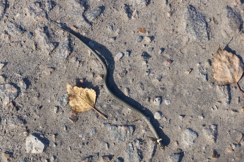 Уже обыкновенный (лат. Natrix natrix) ползет по саду в поисках убежища для сна