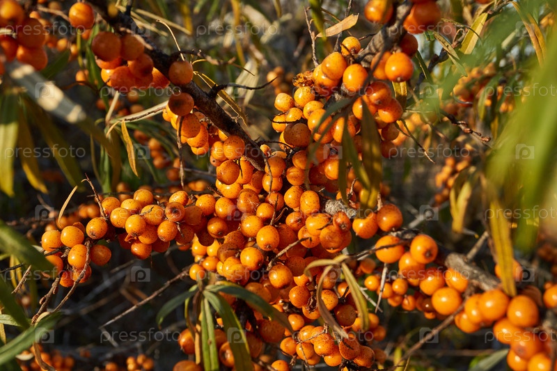 На садовом участке созрела облепиха. Ягоды облепихи на фоне голубого неба и зеленых листьев