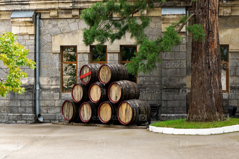 Девять винных деревянных бочек лежат друг на друге
