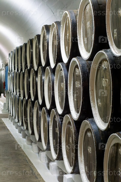 Бочки для виноделия лежат в подвале
