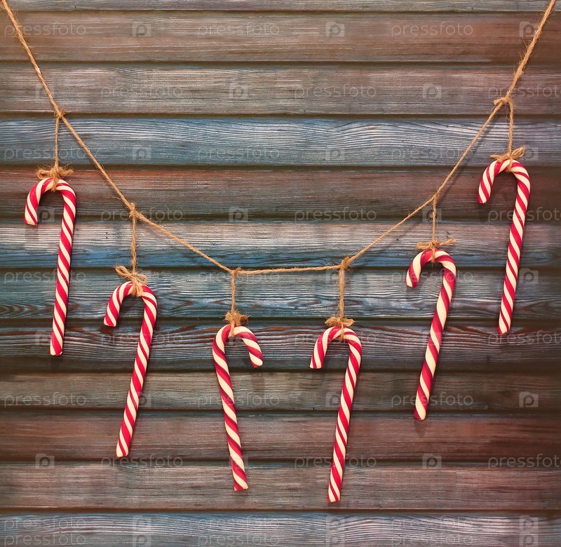 Рождественская новогодняя конфета висит на деревянном фоне с копировальным пространством