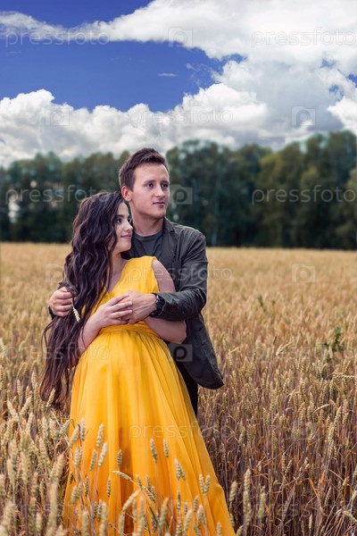 Беременная девушка и парень стоят на пшеничном поле на закате. Выращивание зерна в сельском хозяйстве. Влюбленные молодые люди