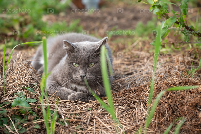 Серый бездомный кот с зелеными глазами наслаждается безмятежной красотой осеннего сезона, окруженный яркой листвой на открытом воздухе. Концепция защиты животных