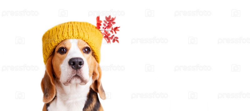 Собака-бигль в вязаной желтой шапке на белом изолированном фоне