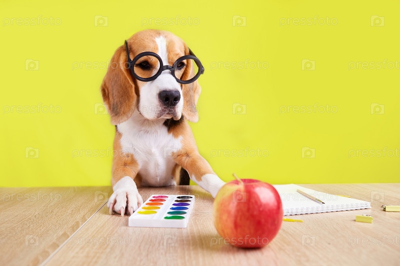 Собака-бигль в круглых очках сидит за столом с акварелью