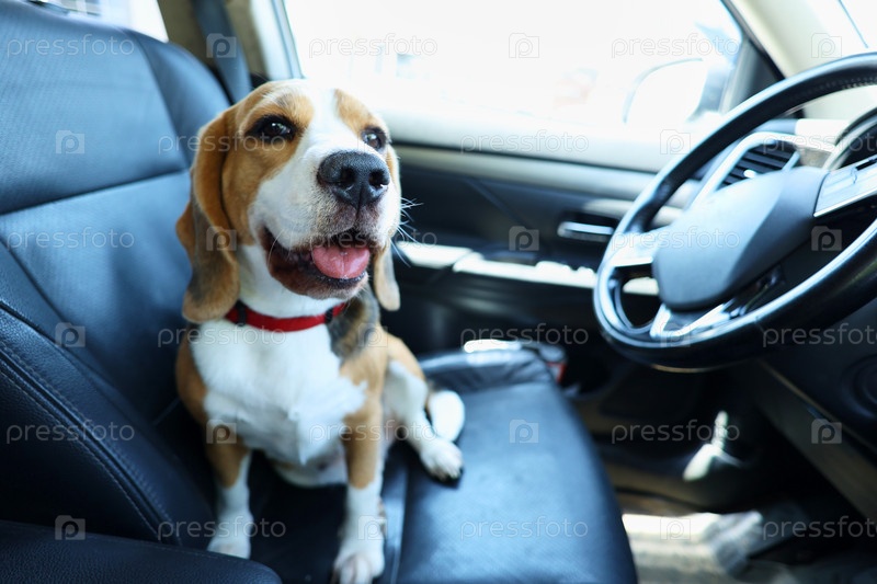 Собака-бигль сидит на переднем сиденье автомобиля и ждет поездки