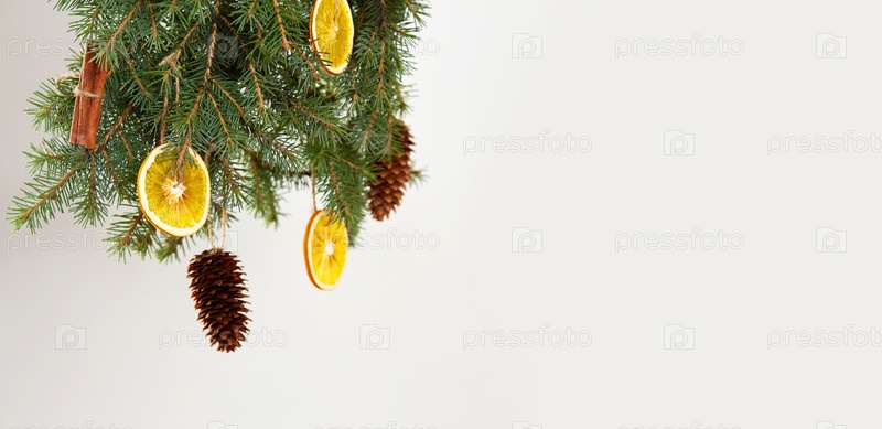 На еловых ветвях висят сушеные дольки апельсина и палочки корицы