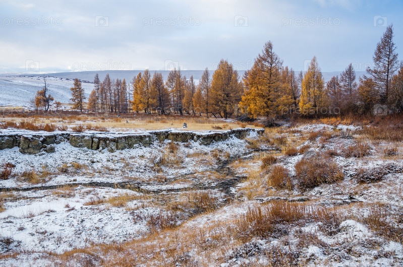 Осенние деревья и свежий снег у ручья на фоне холмов
