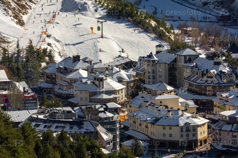 Панорамный вид с воздуха на инфраструктуру горнолыжного курорта в сьерра-неваде, гранаде, испании, временная сезонная концепция