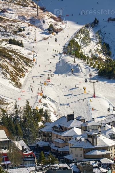 Вид с воздуха, подъемники и склоны горнолыжного курорта с толпами людей, катающихся на лыжах, сьерра-невада, гранада, испания, сезонная концепция