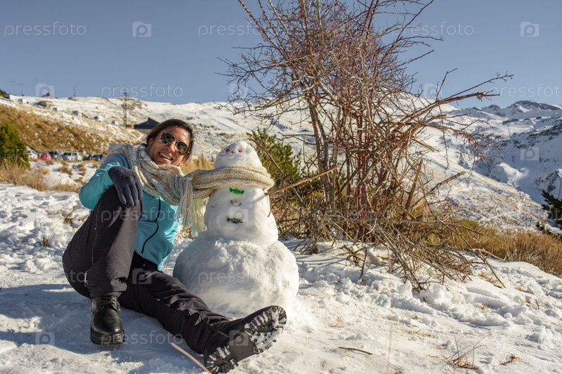 Латинская женщина сидит на мерзлой земле рядом со снеговиком