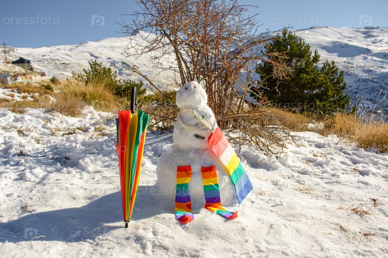 Снеговик, украшенный зонтиком, носками и сумкой, цвета радуги