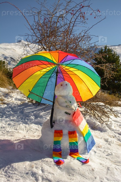 Снеговик, украшенный зонтиком, носками и сумкой, цвета радуги