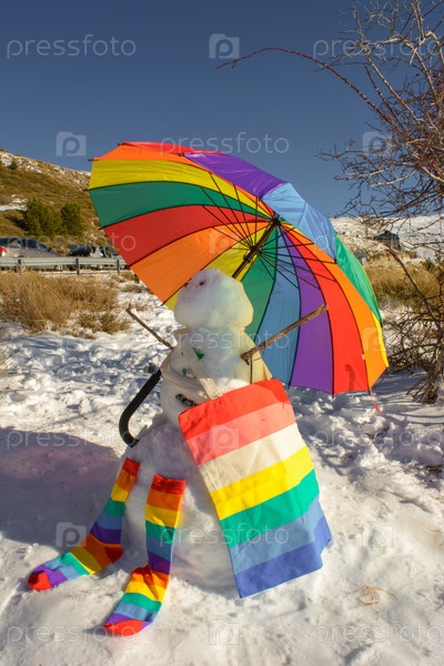 Снеговик, украшенный зонтиком, носками и сумкой, цвета радуги
