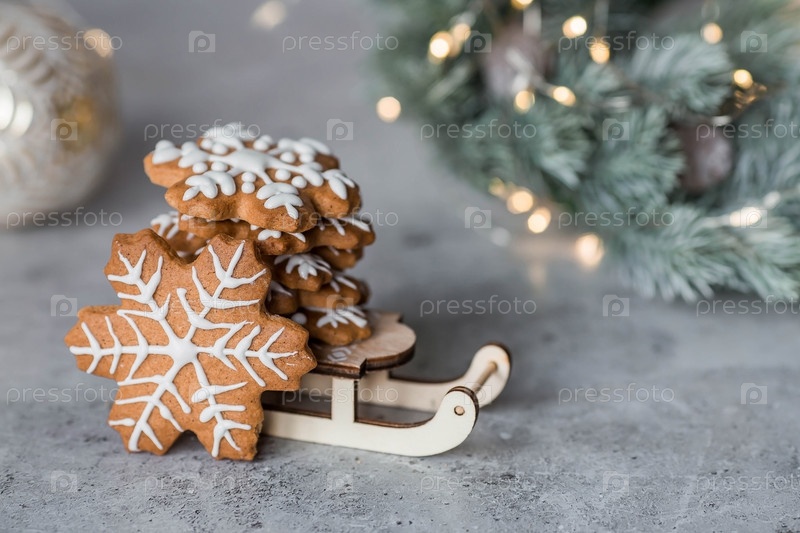 Рождественские пряники домашнего приготовления в сахарной пудре. Вкусные пряники на фоне боке елочных огней. Свежеиспеченные рождественские пряники