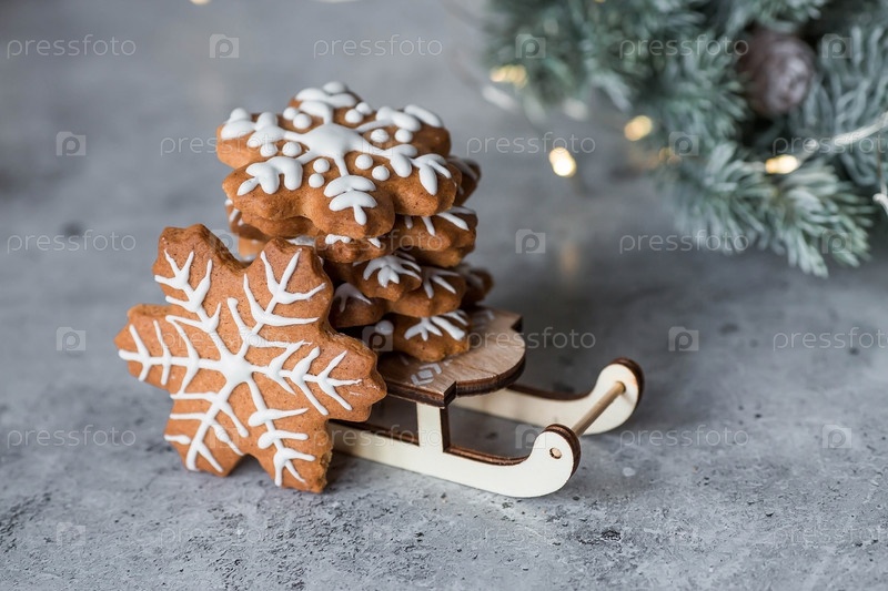 Рождественские пряники домашнего приготовления в сахарной пудре. Вкусные пряники на фоне боке елочных огней. Свежеиспеченные рождественские пряники
