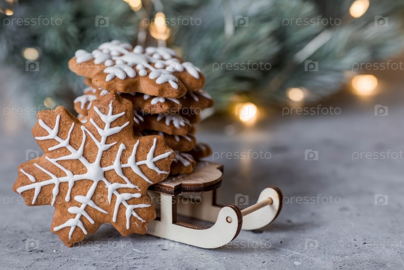 Рождественские пряники домашнего приготовления в сахарной пудре. Вкусные пряники на фоне боке елочных огней. Свежеиспеченные рождественские пряники