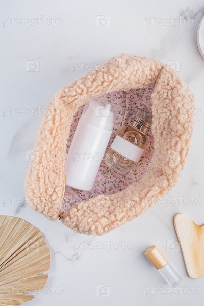 Компактная косметичка и различные косметические средства на белом мраморном столе, плоская планировка