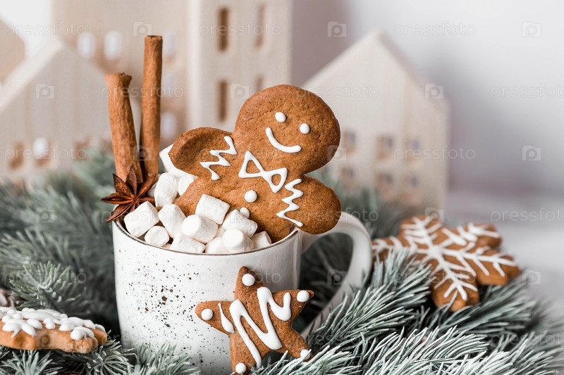 Рождественское имбирное печенье в домашних условиях в сахарной пудре. Вкусный рыжий человечек в кружке с кофе и зефиром на фоне боке елочных огней. Свежеиспеченные имбирные пряники