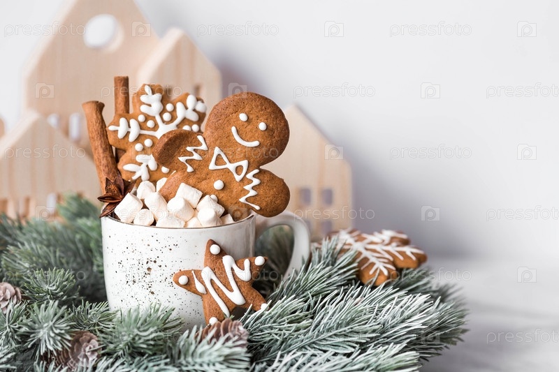 Рождественское имбирное печенье в домашних условиях в сахарной пудре. Вкусный рыжий человечек в кружке с кофе и зефиром на фоне боке елочных огней. Свежеиспеченные имбирные пряники