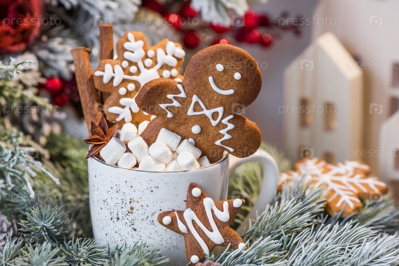 Рождественское имбирное печенье в домашних условиях в сахарной пудре. Вкусный рыжий человечек в кружке с кофе и зефиром на фоне боке елочных огней. Свежеиспеченные имбирные пряники