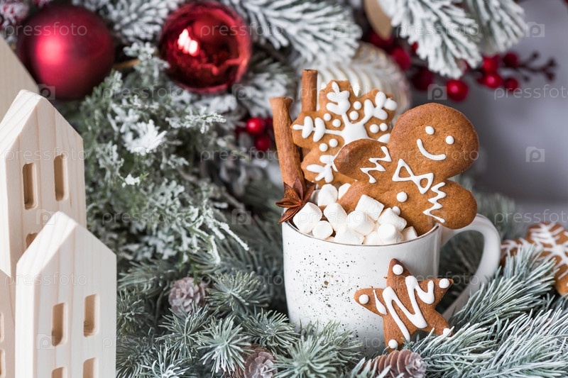Рождественское имбирное печенье в домашних условиях в сахарной пудре. Вкусный рыжий человечек в кружке с кофе и зефиром на фоне боке елочных огней. Свежеиспеченные имбирные пряники